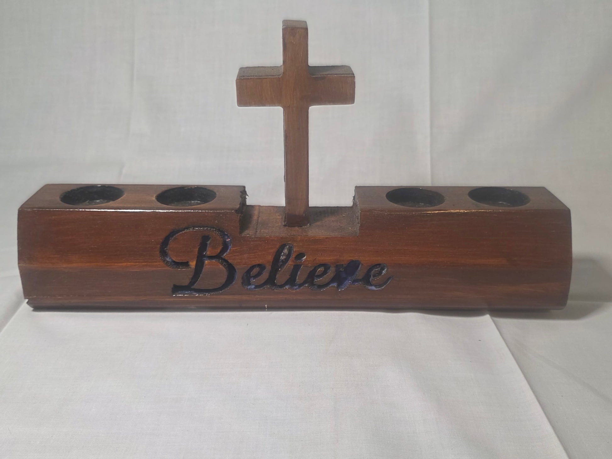 This handcrafted wooden cross candle holder brings warmth and inspiration to any space with its rustic charm and meaningful message. Made from solid wood, this table top piece features a beautifully carved cross as its centerpiece, flanked by four tea light holders that create a serene, glowing ambiance. The word "Believe" is elegantly engraved into the wood, serving as a daily reminder of faith and hope. Each piece showcases the natural wood grain and texture, making every candle holder unique. The rich, warm brown finish enhances its rustic appeal, perfect for creating a peaceful atmosphere in your home, office, or prayer space. Whether displayed on a mantel, dining table, side table, or bookshelf, this decorative piece adds a touch of spiritual elegance to your decor. The four tea light holders provide balanced illumination, casting a gentle, flickering glow that enhances meditation, prayer, or quiet reflection. This solid wood candle holder makes a thoughtful gift for housewarmings, religious occasions, or anyone who appreciates handcrafted home decor with spiritual significance.