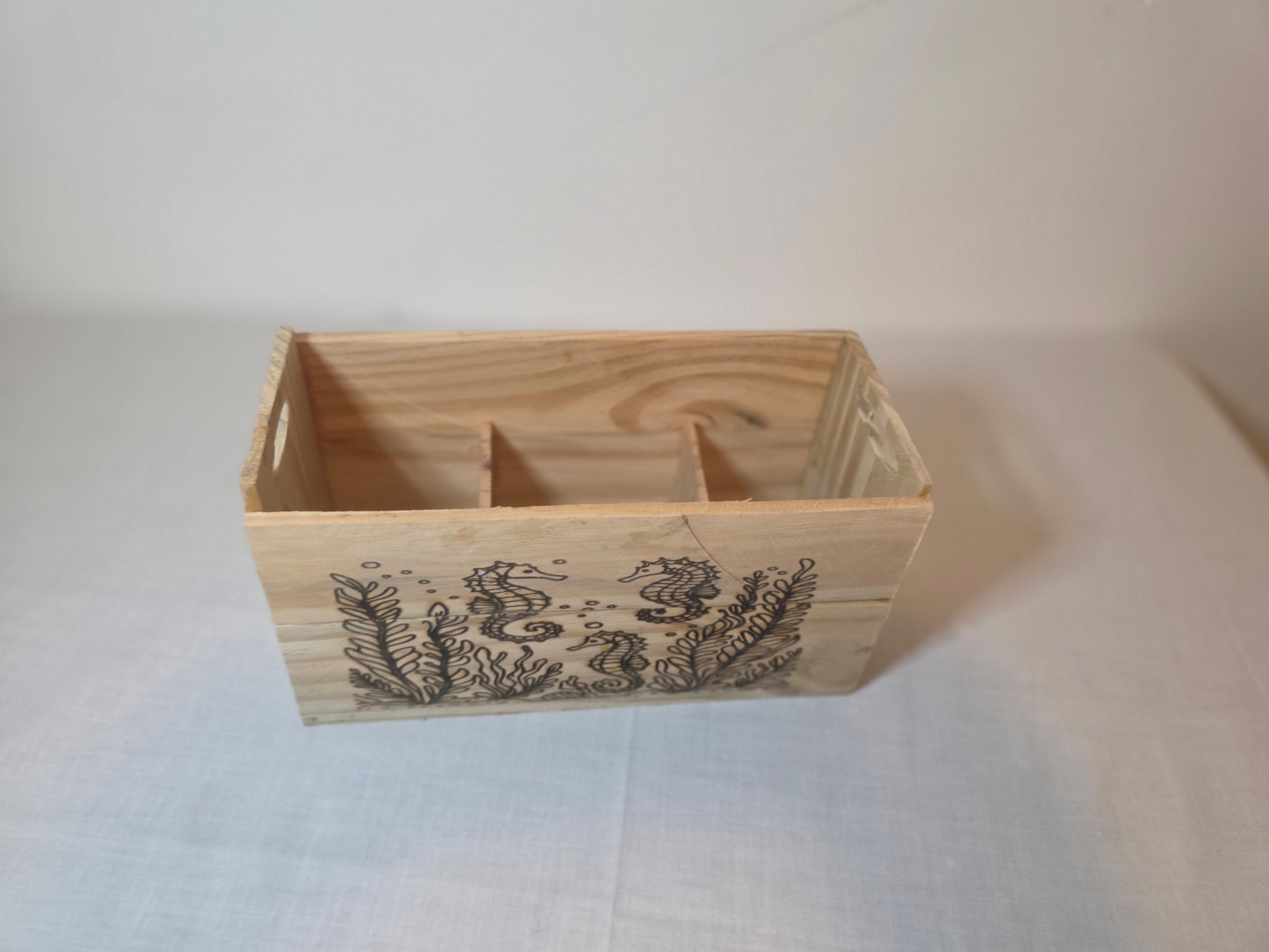 Add a charming nautical touch to your kitchen with this handcrafted solid wood utensil organizer featuring an elegant seahorse and seaweed design. The beautifully laser-etched marine scene brings coastal character while keeping your kitchen tools neatly arranged. This versatile holder includes multiple compartments perfect for storing cooking utensils, whisks, spatulas, and other essential kitchen implements. Crafted from solid wood with careful attention to detail, this organizer combines both functionality and decorative appeal. The natural wood grain adds warmth to your countertop while the divided sections help maintain order in your kitchen workspace. The sturdy construction ensures durability for daily use, while the artistic marine life motif makes this piece both a practical storage solution and an attractive accent piece. Keep your cooking tools organized and within easy reach with this thoughtfully designed kitchen accessory.